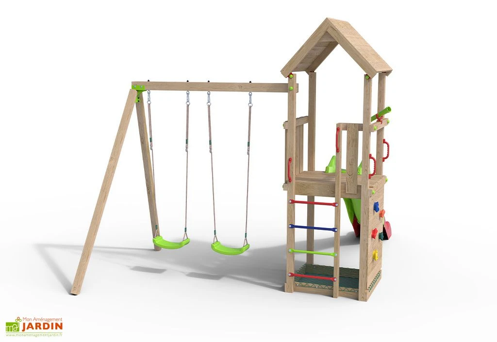 Notez que l’aire de jeu portique est recommandée aux enfants âgés de 3 à 12 ans, notamment grâce au réglage de la hauteur des balançoires. Elle mesure 3,08 m de hauteur, 4,03 m de profondeur et 2,84 m de hauteur. La poutre principale du portique dispose d’une section de 9 x 9 cm et les poteaux du portique possèdent une section de 7 x 7 cm, les pièces de jonction sont en métal vert.