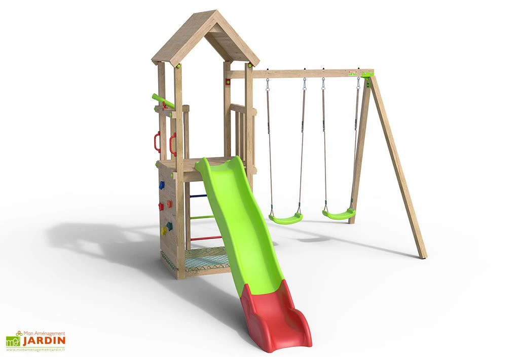 L’aire de jeux Smart Xplorer de Trigano comprend une plate-forme d’une hauteur de 1,20 m avec une cabane, un portique de 2 balançoires, un toboggan vert pomme et rouge de 2,63 m de long, d’un bac à sable de 90 x 70 cm avec un filet de protection et pour les plus aventuriers un mur de grimpe et un télescope.