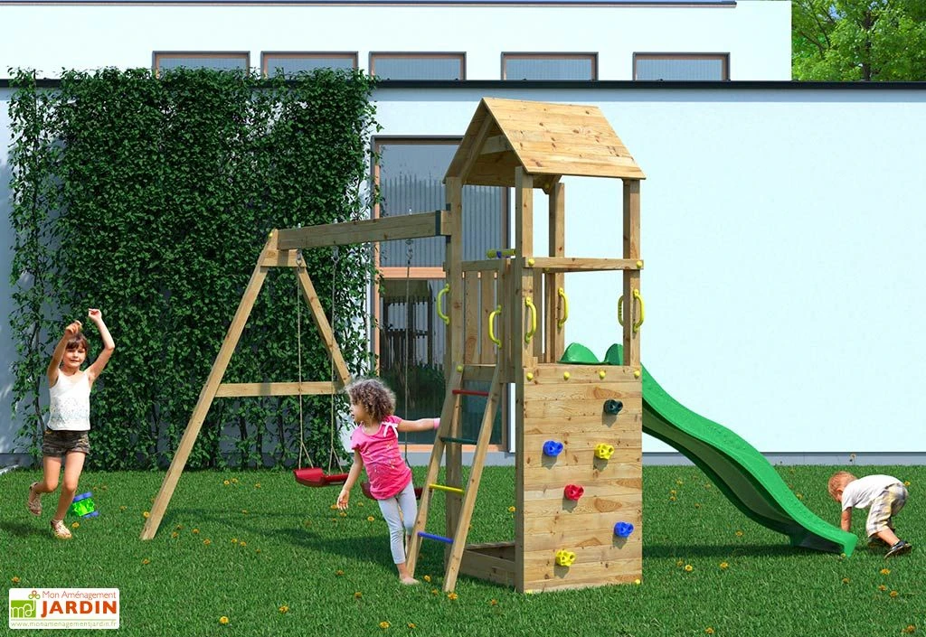 L’aire de jeux Flappi de chez Fungoo comprend une tour dont la plateforme dessert un toboggan d’une longueur de glisse de 2,20 m, un petit mur d’escalade et un portique avec deux balançoires. Le tout est livré en kit et devra être monté par vos soins (ensemble d’outils, kit d’ancrage, crochets pour balançoires et visserie en inox inclus). Vous pourrez par ailleurs choisir la couleur du toboggan parmi les coloris proposés : rouge, vert, bleu et jaune.