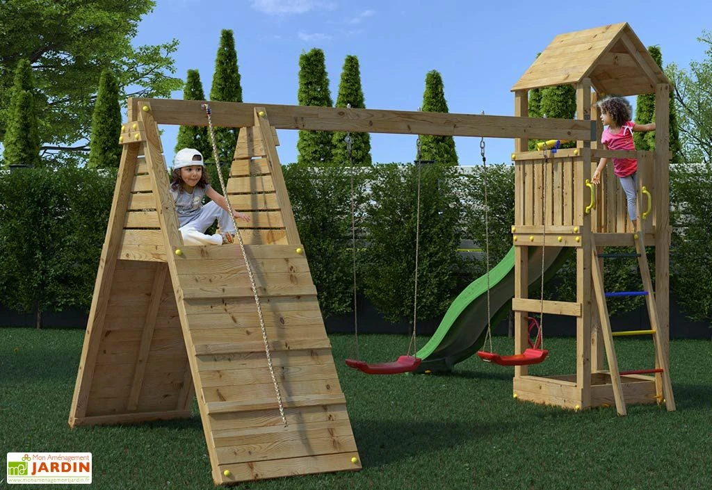 Livrée en kit, cette aire de jeux pour enfants est à monter soi-même. Les pièces en bois sont accompagnées de tous les éléments nécessaires à l’installation de l’ensemble, à savoir des outils, la visserie en inox, le kit d’ancrage et les crochets pour balançoires. Le tout est conforme à la norme EN 71 et occupera une surface de 15,99 m² dans votre jardin une fois monté.