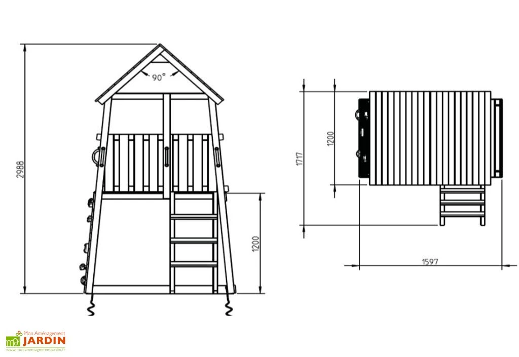 L’aire de jeux mesure 171,7 cm de longueur, 159,7 cm de largeur et 298,8 cm de hauteur. Elle est livrée en kit à monter soi-même. Une notice de montage et tous les accessoires de montage sont fournis. Elle respecte les normes TUV Nord, DIN EN 71-1, -2 et -3.
