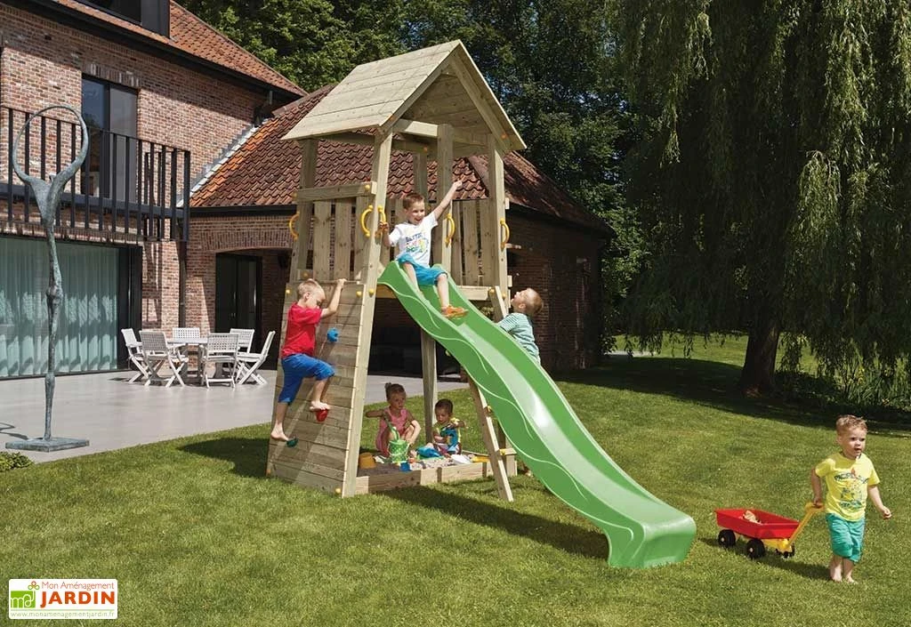L’aire de jeux dispose de poteaux de section 88 x 88 mm et d’une plateforme située à 1,20 m du sol. Le toboggan mesure 2,40 m de longueur. Il est vert et dispose d’un système permettant à l’eau de ruisseler, pour en faire un toboggan à eau.