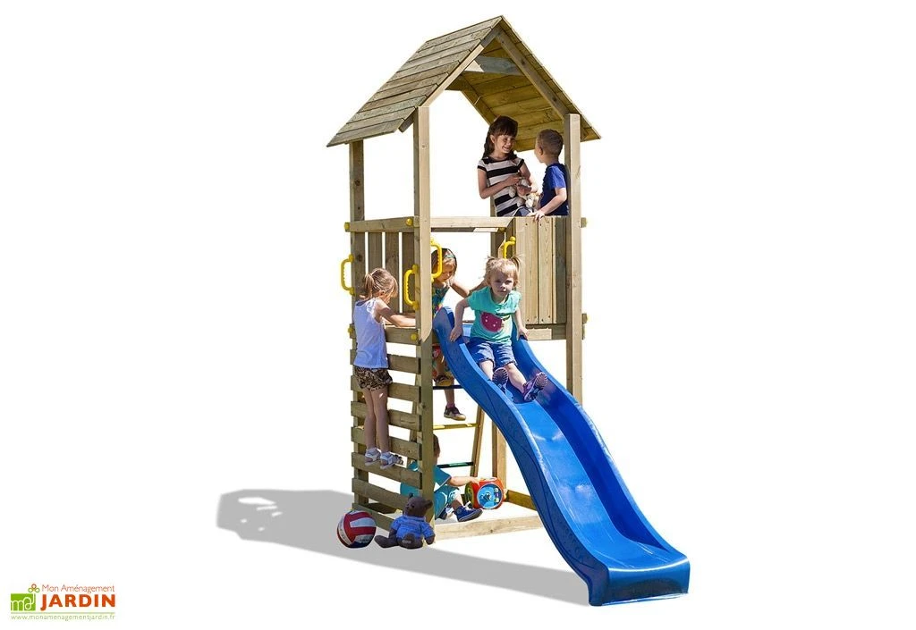 L’aire de jeux en bois de Fungoo est constituée d’une grande tour de 2,90 m avec une toiture double pente. La tour est équipée d’un mur d’escalade en bois, d’une échelle avec des barreaux métalliques et d’un toboggan de 220 cm de longueur.