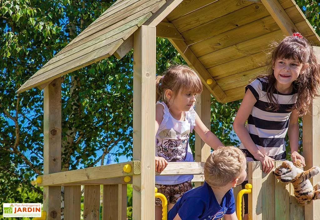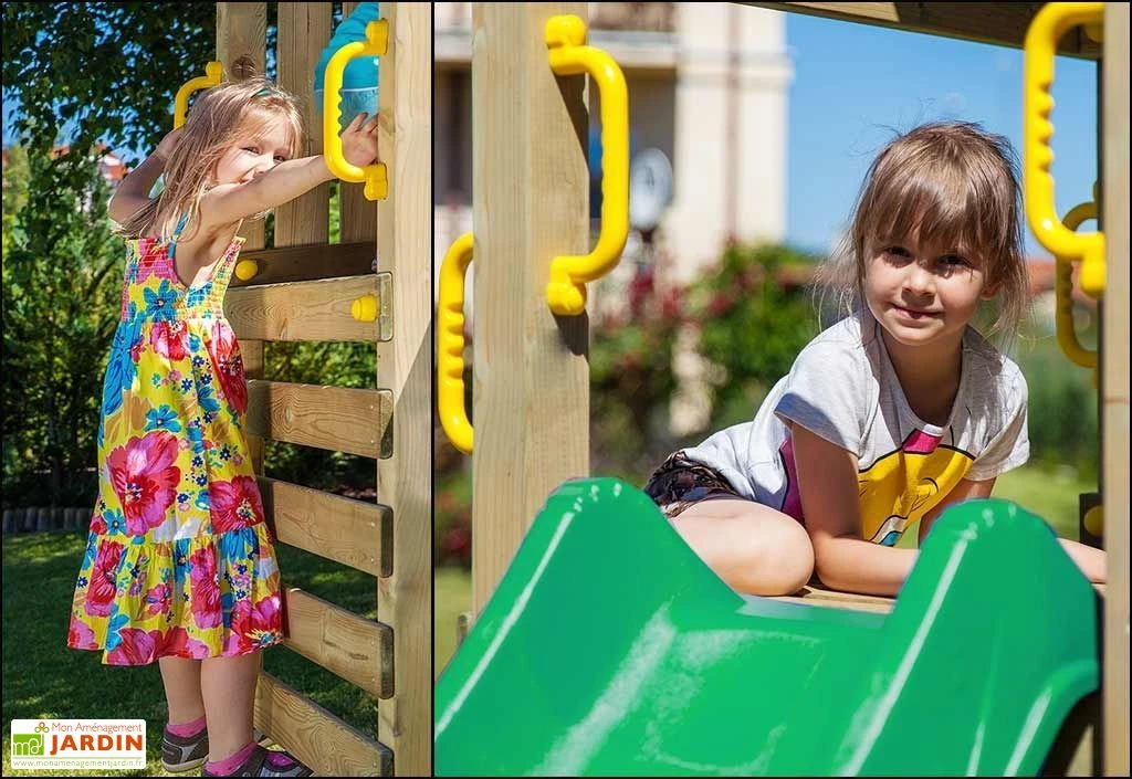 L’aire de jeux est en bois traité autoclave. Le bois est imprégné d’une solution fongicide et insecticide qui protège parfaitement la tour. Ce traitement permet de limiter l’entretien au maximum. Le bois est certifié FSC.