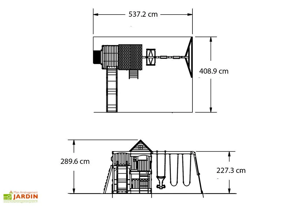 L’aire de jeux mesure au total 4,09 m de longueur, 5,37 m de largeur et 2,90 m de hauteur. Elle est livrée en kit et se monte facilement grâce à des panneaux percés et déjà teintés avec une teinture à base d’eau. La garantie est de 2 ans.