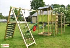 Le bois utilisé pour la fabrication de cette aire de jeu est certifié FSC, ce qui signifie qu’il est issu de forêts gérées de manière durable. Pour assurer la bonne protection du bois contre l’humidité, la moisissure et les insectes susceptibles de le détériorer, pensez à y appliquer un traitement fongicide et insecticide.
