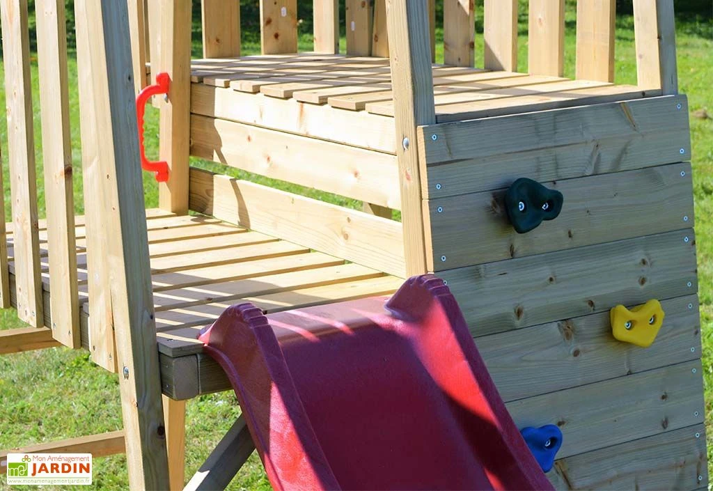 Ses deux plateformes situées à 90 et 120 cm de hauteur pourront être aisément atteintes grâce à la présence d’une petite échelle légèrement inclinée et la table de pique-nique logée sous la plateforme la plus haute permettra à vos enfants de dessiner ou de prendre le goûter en plein air !
