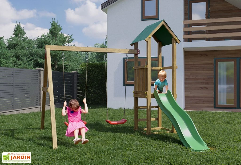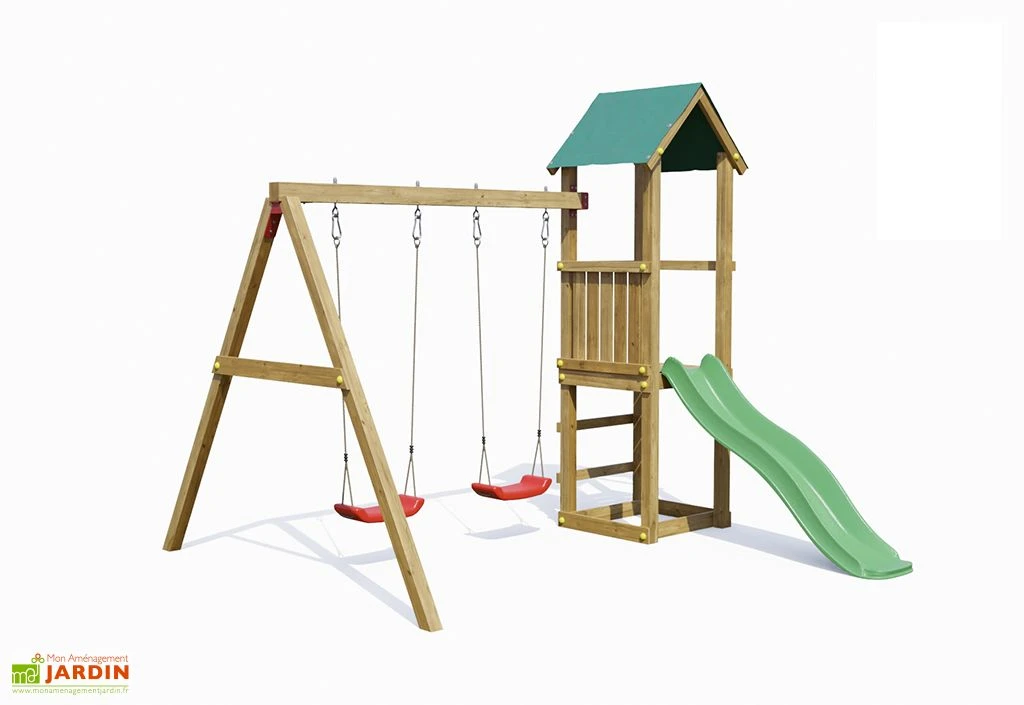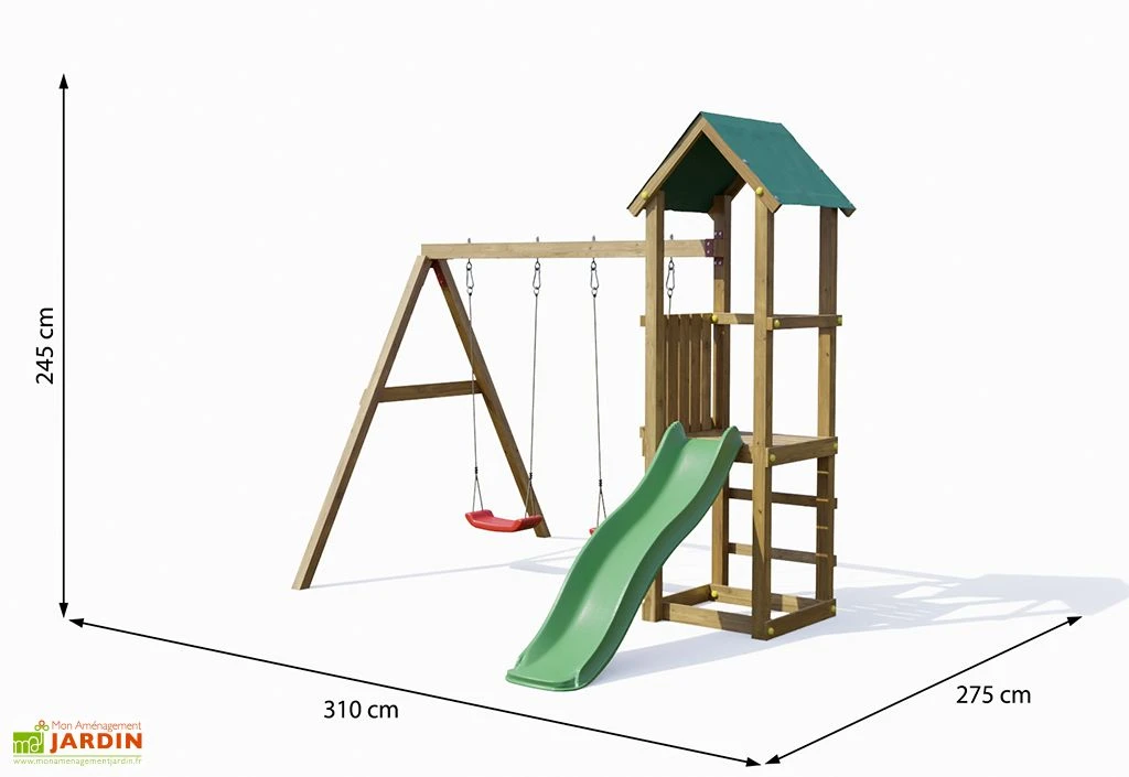L’aire de jeux pour enfants comprend deux balançoires rouges fournies avec leurs crochets et un toboggan vert qui fait 1,75 m de longueur de glisse. Des ancrages sont prévus pour installer la structure au sol.