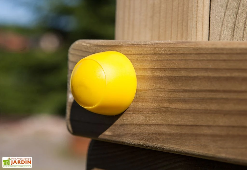 L’aire de jeux en bois peut accueillir jusqu’à trois enfants en même temps. La plateforme en bois où se situe le toboggan mesure 90 cm de haut et possède un toit pour protéger les enfants du soleil et de la pluie. Ils peuvent y accéder à l’aide d’une échelle en bois.