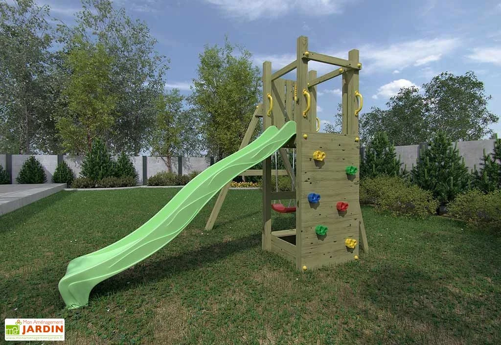 L’aire de jeux Fungoo est idéale pour les petits espaces puisqu’elle a la particularité de proposer un maximum de jeux pour un minimum de place. Elle mesure 2 m de longueur, 2,90 m de largeur et 2,10 m de hauteur et dispose d’une tour avec portique, toboggan, mur d’escalade et bac à sable.