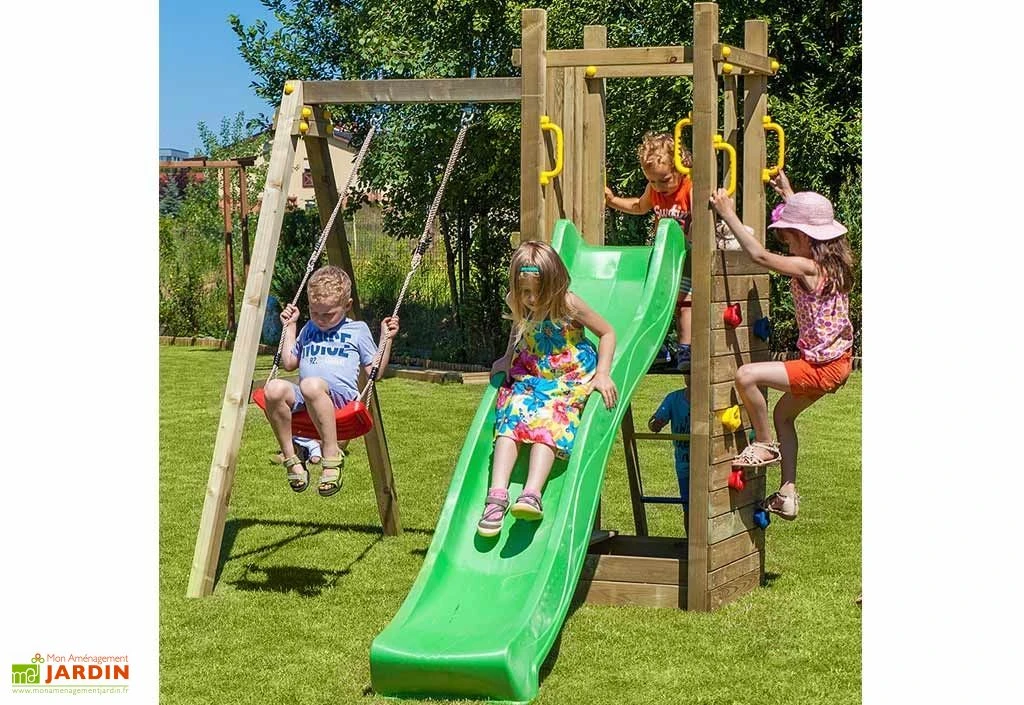 L’aire de jeux peut être utilisée par 5 enfants en même temps. Elle est livrée en kit avec les outils nécessaires à son montage. (Temps de montage estimé à 4h pour 1 personne).
