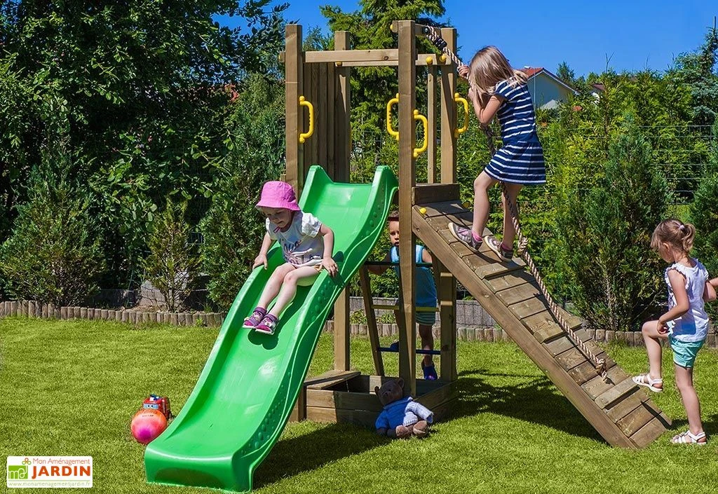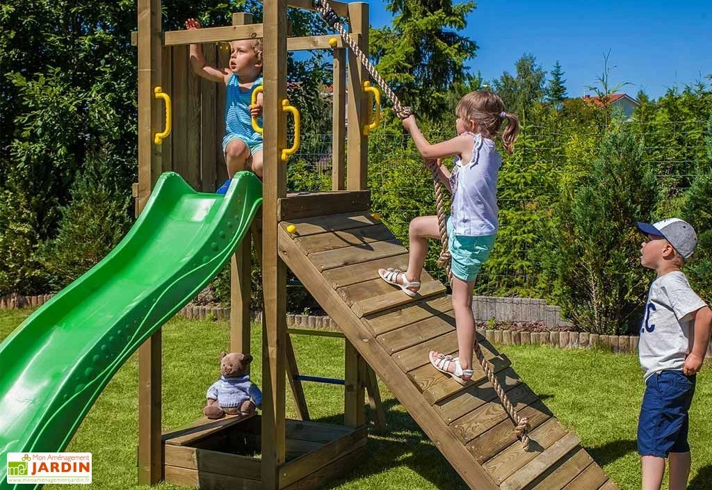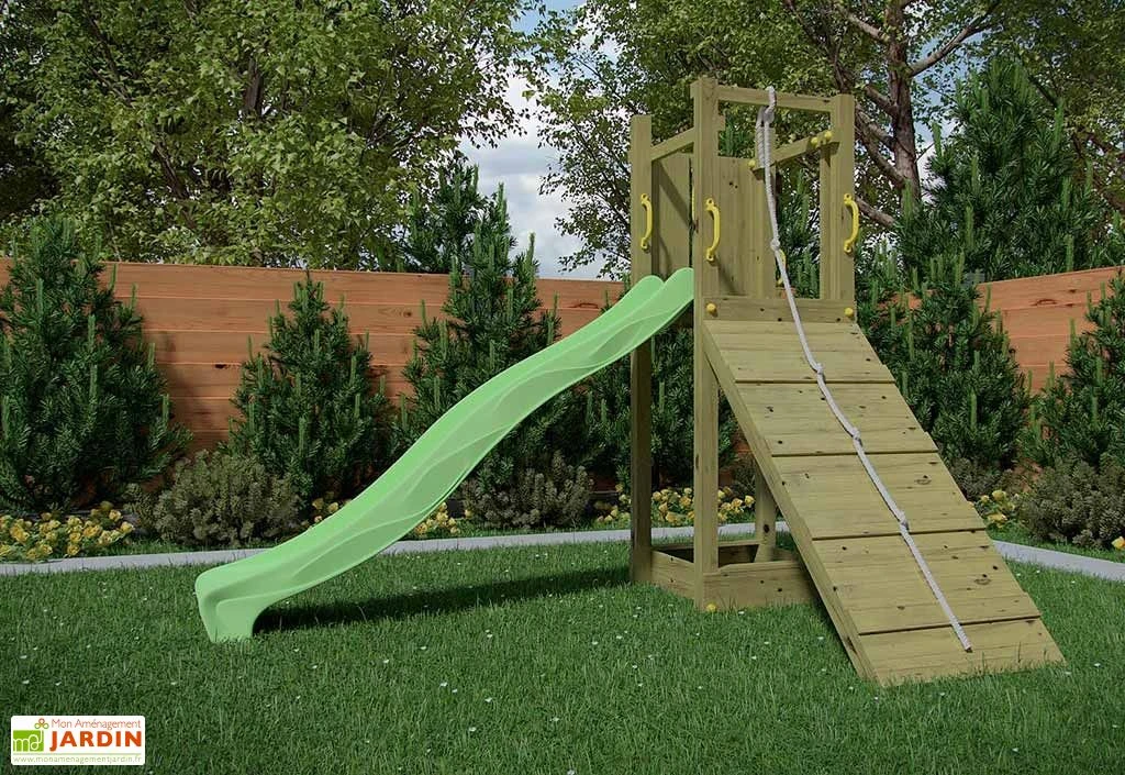 L’aire de jeux est composée d’une tour de 2,10 m de hauteur avec une plateforme située à 1,25 m de hauteur. Une échelle en métal et une rampe en bois avec un cordage vous permet d’accéder à la plateforme. Un toboggan de 2,20 m permet d’en descendre.