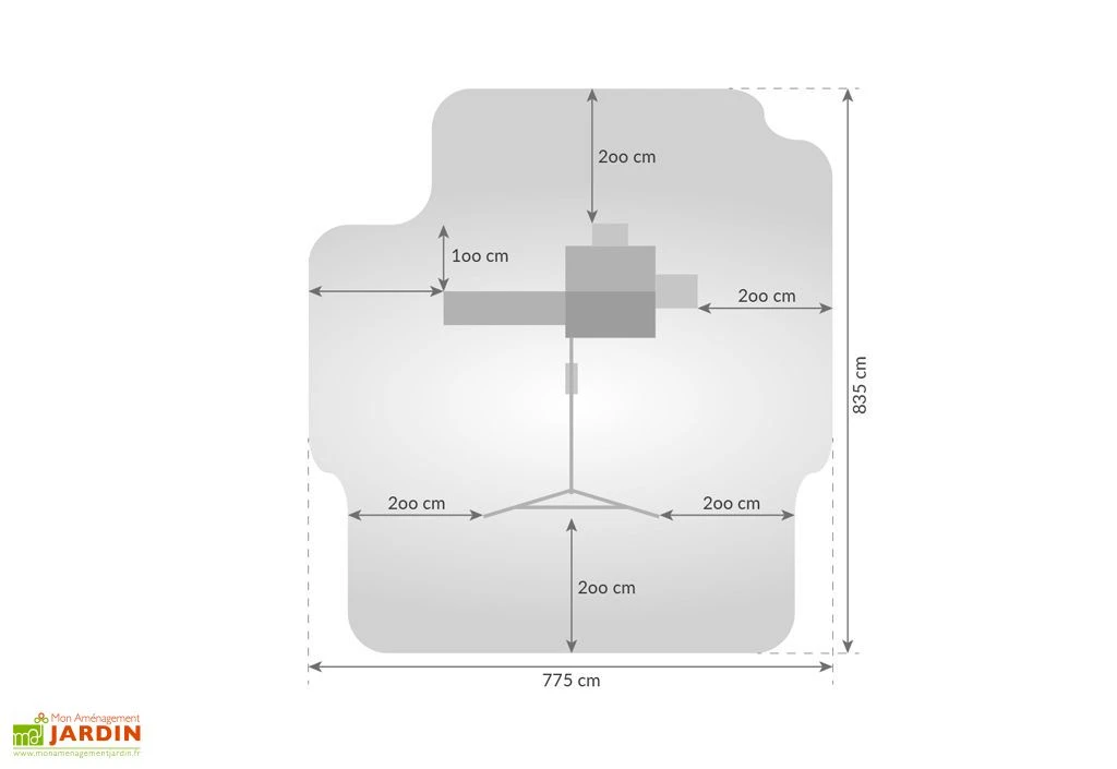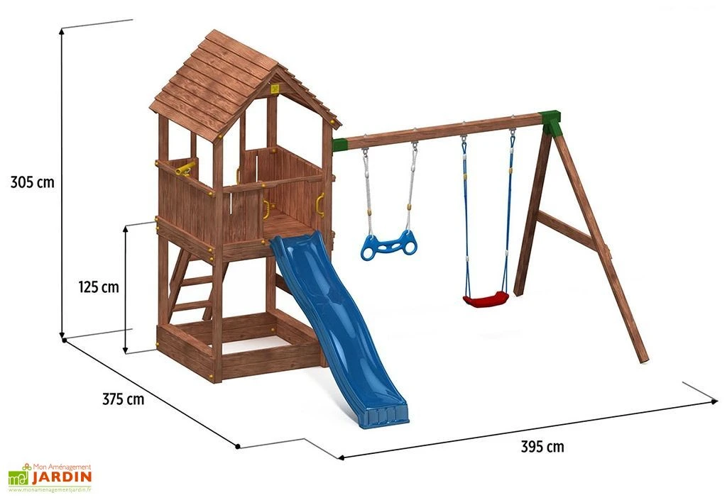 L’aire de jeux en bois de Fungoo est recouverte d’une lasure. Elle est étudiée pour permettre à 7 enfants de jouer dessus en même temps grâce à tous ses agrès. Elle mesure 3,75 m de longueur, 3,95 m de largeur et 3,05 m de hauteur. Sa plateforme de 120 x 120 cm se situe à 125 cm du sol.