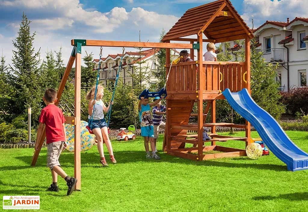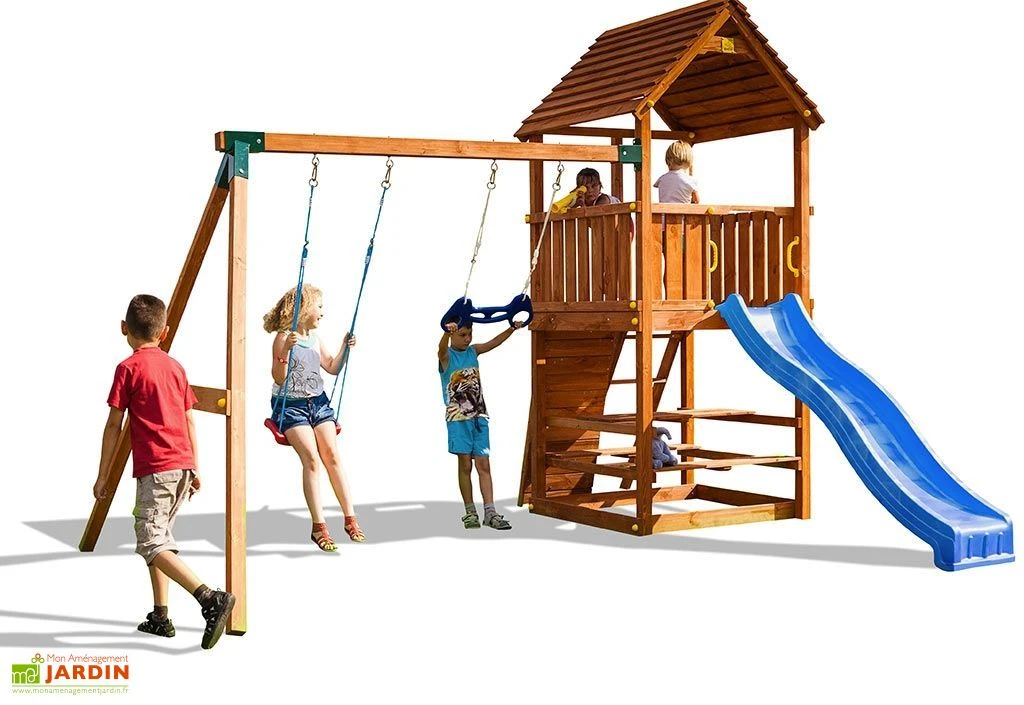 L’aire de jeux est livrée en kit à monter soi-même. La livraison comporte tous les outils nécessaires à son installation, la visserie en inox, un kit de crochets pour les balançoires et des pièces en bois. Le temps de montage est estimé à un peu moins d’une journée à deux. L’aire de jeux bénéficie d’une garantie de 2 ans.