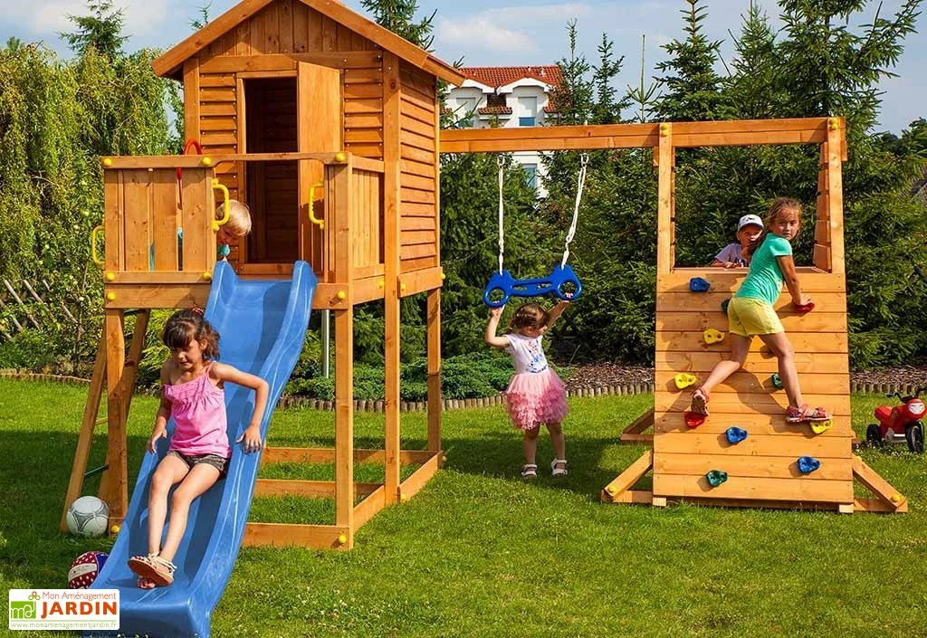 Le temps de montage est estimé à une journée pour deux personnes. L’aire de jeux respecte les normes EN 71 pour une utilisation en toute sécurité. La garantie est de 2 ans.