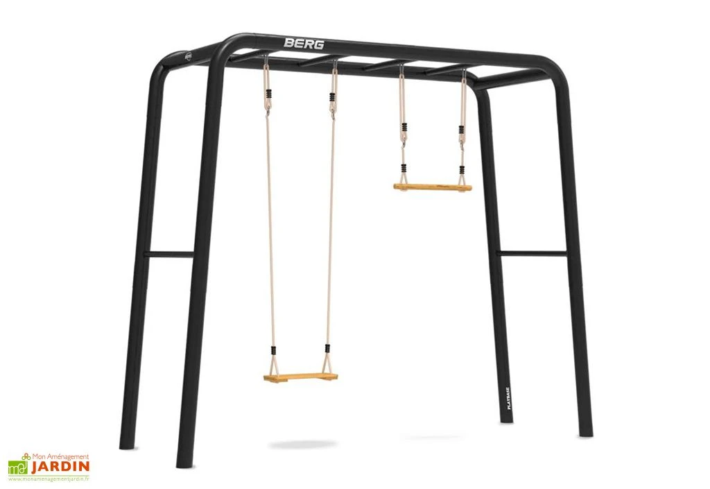 PlayBase de chez Berg est une gamme de structures de jeux modulables disponibles en plusieurs dimensions et configurations que vous pouvez transformer facilement grâce à des agrès qui s’installent et se retirent en un instant. Le modèle Medium TT présenté ici est équipé d’un barreau de chaque côté, d’une échelle de suspension, d’une balançoire et d’un trapèze.