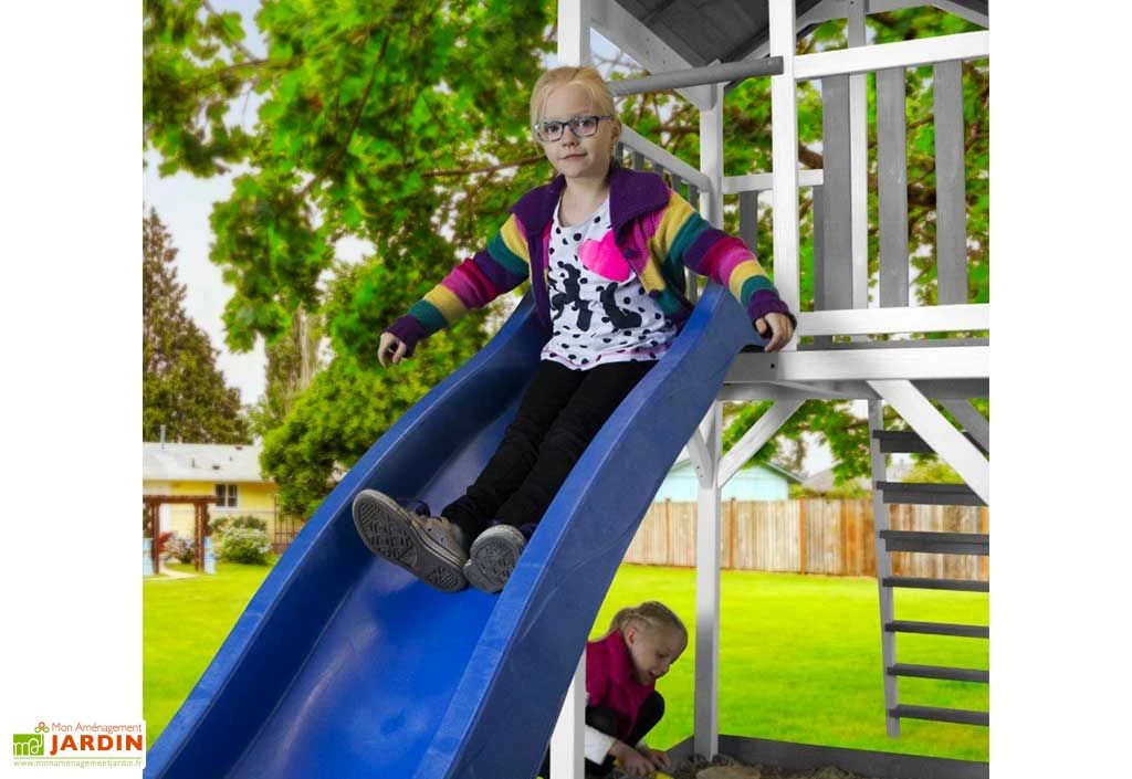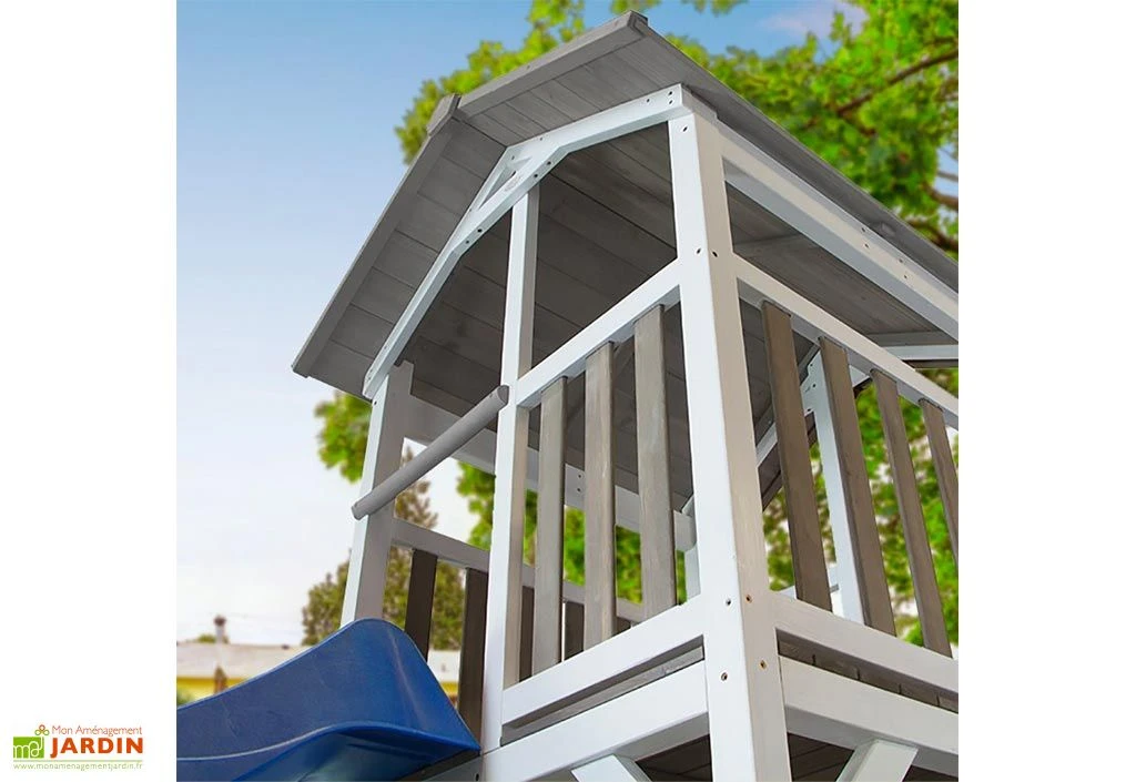 L’aire de jeux Beach Tower de la marque Axi se compose d’une tour avec plateforme, d’un toboggan Ă vagues en plastique de 2,20 m de long et d’un emplacement pour bac Ă sable, situĂ© sous la tour. Ce dernier pourra contenir environ 125 kg de sable (sable non fourni). Le tout est destinĂ© aux enfants Ă partir de 3 ans et est conforme aux normes CE et EN71.Â
