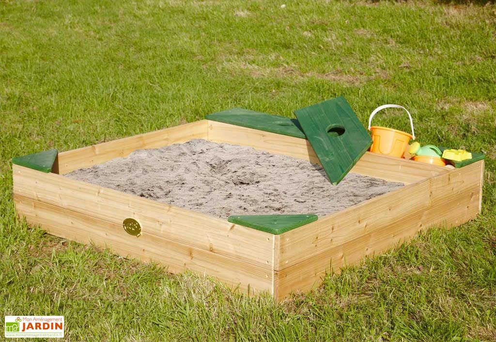 Le bac à sable inclut une housse en plastique verte permettant de couvrir l’espace de jeu afin de le protéger des intempéries. Le bac possède une capacité de 250 kg de sable (non fourni). Il n’est pas traité chimiquement afin d’être plus écologique et plus sûr pour les enfants. Le bois est recouvert d’un vernis aqueux pour préserver son bel aspect dans le temps.