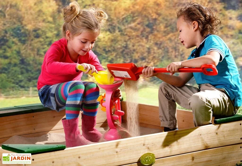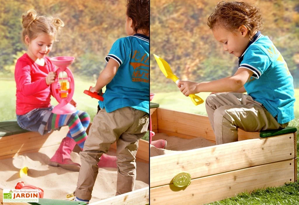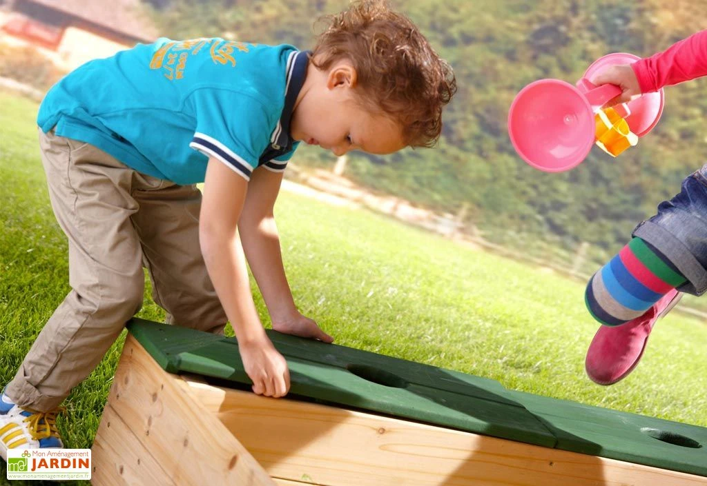 Le bac de jeu dispose de deux espaces de rangements pour jouets avec tablettes permettant de servir de banc. Ces tablettes présentent chacune un trou pour placer un parasol afin de protéger vos enfants lorsque le soleil brille intensément. Il dispose également d’assises sur les angles.