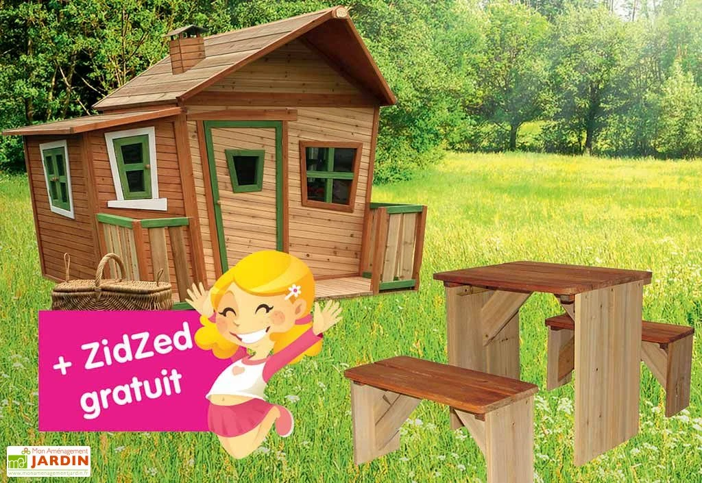 La maisonnette de chez Axi est livrée avec la table de pique-nique ZidZed GRATUITEMENT jusqu’au 30 avril 2016. La cabane mesure 1,80 m de longueur, 1,80 m de largeur et 1,67 m de hauteur. Elle convient à des enfants à partir de 3 ans et peut supporter jusqu’à 150 kg. Elle est en cèdre FSC non traité chimiquement. La cabane dispose de parois de 15 mm d’épaisseur et d’un châssis de 38 mm. Elle est équipée d’une petite terrasse de 0,61 x 1,80 m, d’une porte et de fenêtres qui s’ouvrent et se ferment grâce à un système d’aimant. La maisonnette ne demande aucun traitement ni entretien.