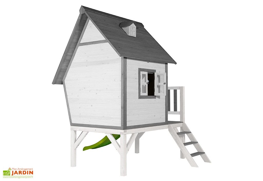 La cabane sur pilotis possède une petite terrasse accessible par un escalier et de laquelle vos enfants pourront descendre via un toboggan. Elle est fabriquée hemlock, bois naturellement imputrescible qui ne nécessite pas d’entretien ou de traitement chimique ! Elle est certifiée FSC, ce qui signifie que le bois provient de forêts gérées durablement.