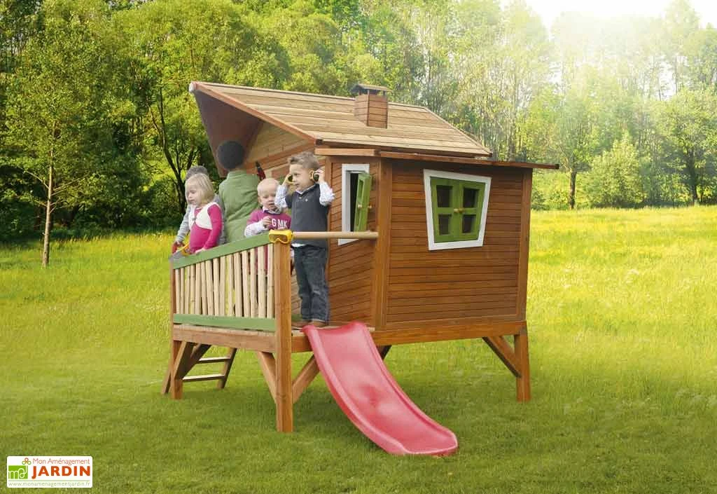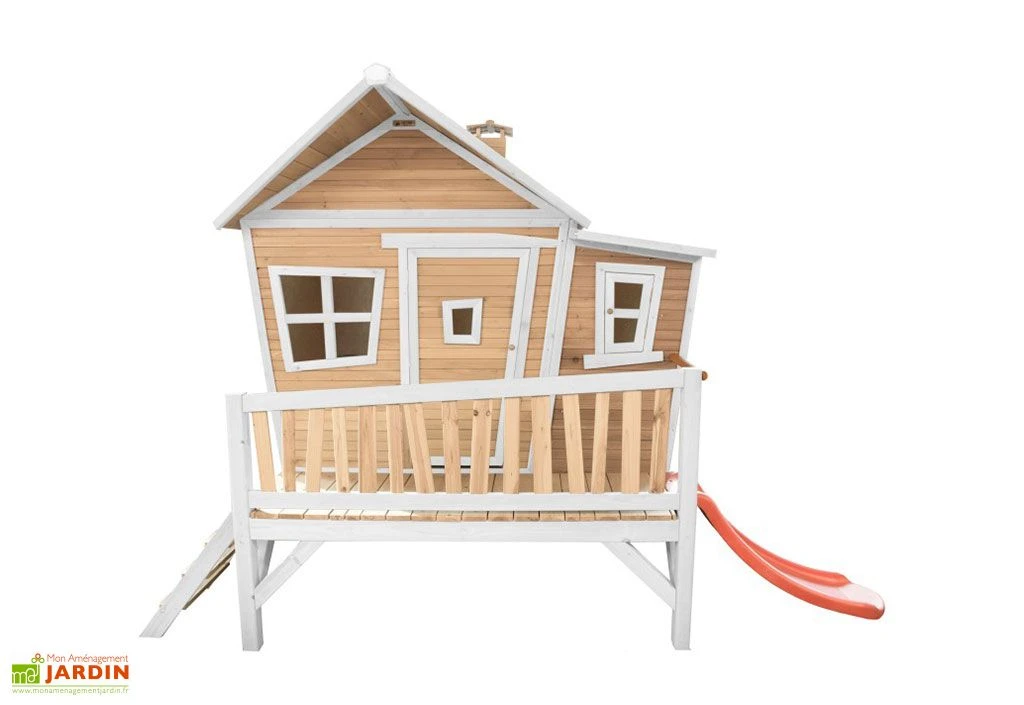 Cette cabane en bois est montée sur pilotis. Elle mesure 1,93 x 3,49 m, possède une petite terrasse et est équipée d’un toboggan en plastique de 120 cm de long. Ses parois de 15 mm d’épaisseur intègrent une porte à fermeture aimantée et quatre fenêtres avec vitres en plexiglas. Le tout est livré en kit, à monter soi-même (temps de montage : environ 1h40).