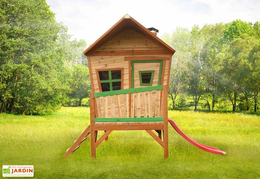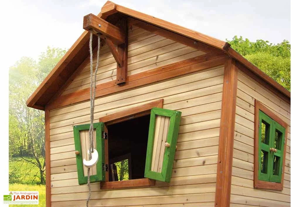 Cette cabane pour enfant est fabriquée en bois de Hemlock certifié FSC, une essence très résistante qui ne craint ni l’humidité, ni les champignons et autres attaques d’insectes susceptibles de détériorer le bois, et ce même sans traitement. Ses parois de 15 mm d’épaisseur intègrent une porte à fermeture aimantée et trois fenêtres avec vitres en plexiglas. Le toboggan de 120 cm de long est pour sa part conçu en plastique, un matériau qui lui aussi ne nécessite aucun entretien particulier.