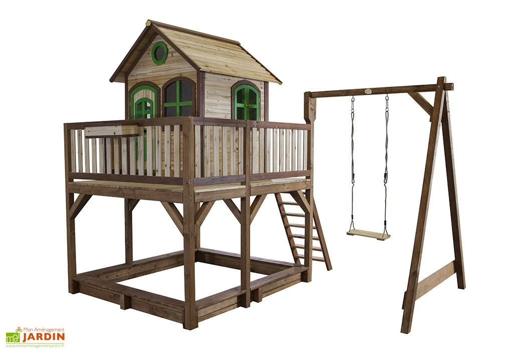 Pensée pour les enfants dès 3 ans, la cabane Liam 2 de chez Axi est une véritable aire de jeux composée d’une maisonnette, d’un bac à sable (sable non fourni), d’un toboggan et d’une balançoire. Elle est fabriquée en Hemlock, un bois naturellement résistant aux intempéries, à l’humidité et à la moisissure, le tout sans nécessiter d’entretien ou de traitement. Ce bois, recouvert d’une lasure non chimique, est de plus certifié FSC, ce qui indique qu’il provient de forêts gérées de façon écoresponsable.