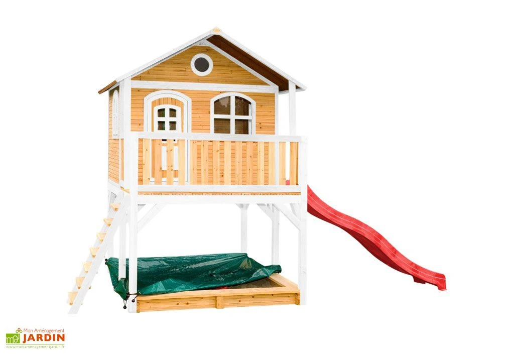La cabane sur pilotis dispose d’un toboggan de 2,28 m. L’enfant y accĂšde grĂące Ă une Ă©chelle et Ă une plateforme. Un bac Ă sable se situe sous la maison. Elle rĂ©pond aux normes EN71-1, EN71-3, EN71-8. Une bĂąche de protection pour le bac Ă sable est incluse.