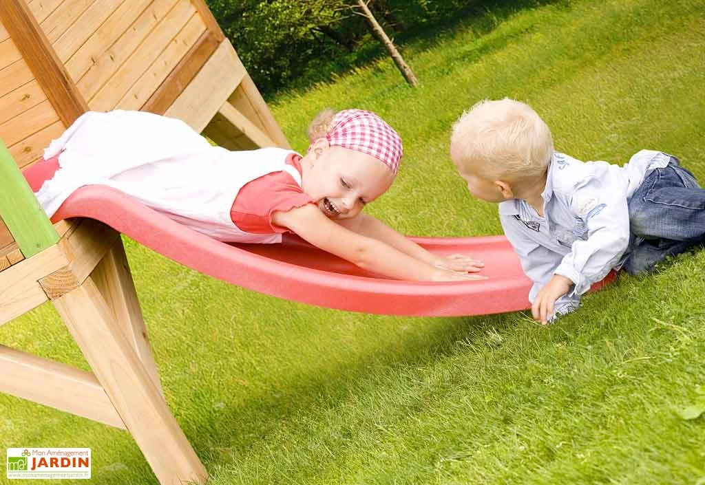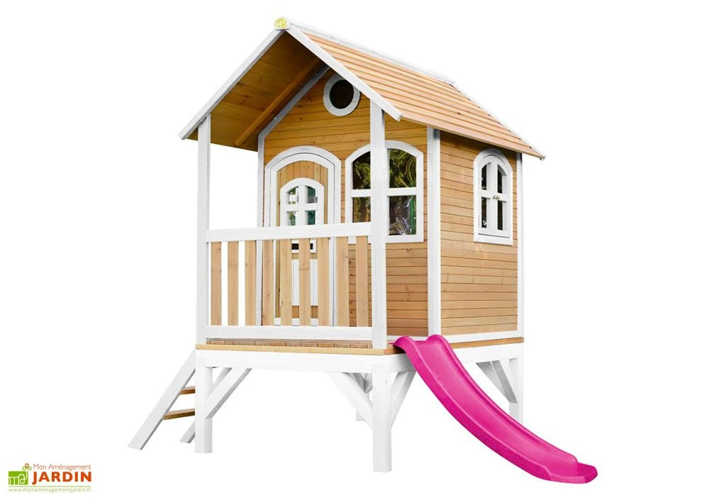 La maison pour enfant Tom de la marque Axi est conçue en bois de hemlock et cyprès. Cette cabane est une véritable aire de jeu pour votre enfant. Elle est montée sur pilotis et possède une petite terrasse accessible par une échelle. Votre enfant pourra en redescendre grâce au toboggan de 1,18 m dont elle est équipée.