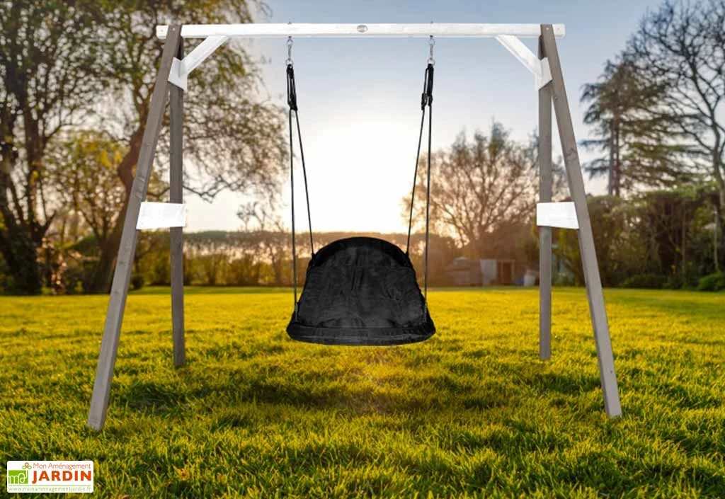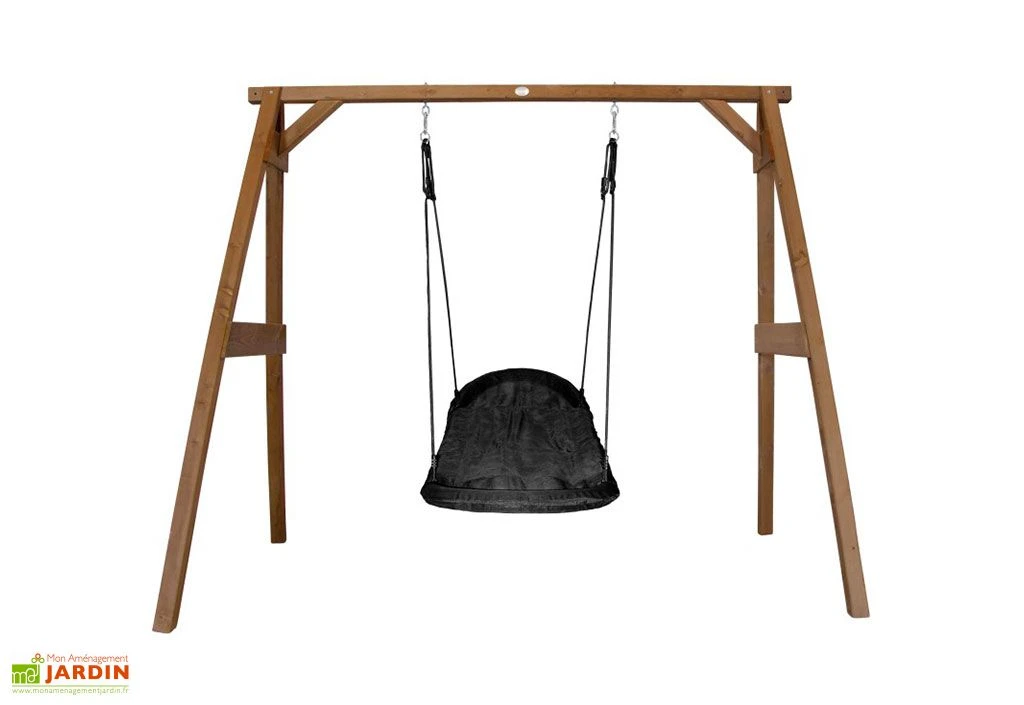 Ce portique en bois de chez Axi est destiné aux enfants âgés d’au moins 3 ans. Il dispose d’une balançoire nid d’oiseau ovale solide et confortable (structure en acier rembourrée à l’aide de mousse) capable de supporter un poids maximum de 150 kg. Le tout est conforme aux normes CE et EN71 et est livré en kit. Cette balançoire devra donc être montée par vos soins (ancrage inclus, assemblage facile).