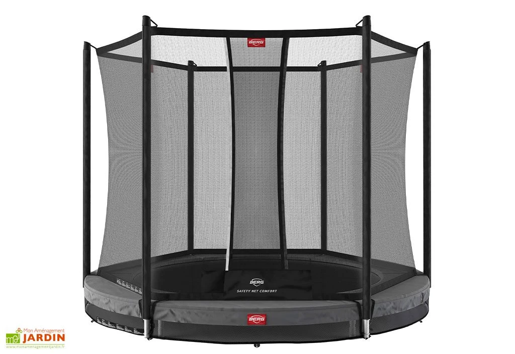 Très résistant, ce trampoline possède un cadre solide en acier de 42 mm de diamètre. Le modèle enterré a pour avantage d’être au même niveau que le sol de votre jardin, ce qui garantit une grande sécurité, notamment pour vos enfants. À noter que le trampoline Berg peut supporter une charge maximale de100 kg. Lors de son installation, veuillez prévoir un périmètre de sécurité d’au moins 2 mètres autour du trampoline enterré.