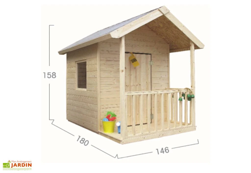 Cette maisonnette en bois dispose de dimensions totales de 146 x 180 x 158 cm (l,l,h) avec une épaisseur de bois de 12 mm. Elle possède des dimensions intérieures de 114,7 x 117 cm, soit 1,34 m². Sa porte battante affiche une largeur de 50,6 cm. Cette cabane naturelle et saine répond parfaitement à la norme EN71, ce qui est un gage de sécurité pour vos enfants.