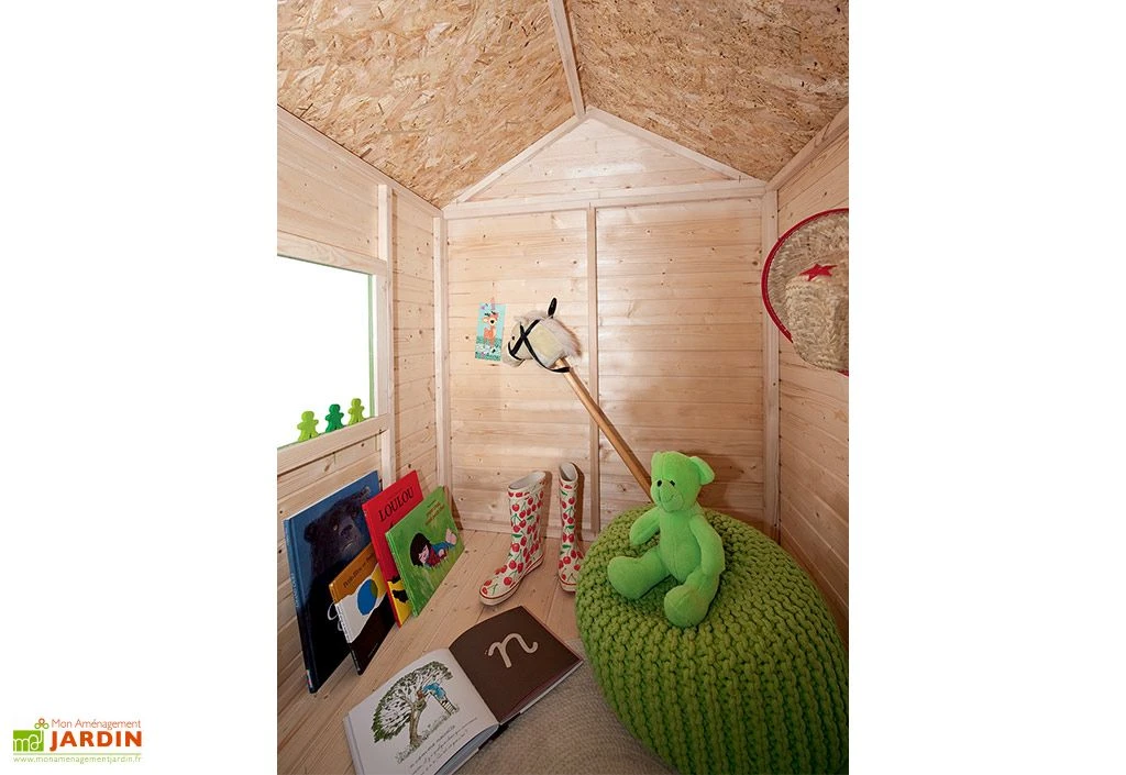 La maison est livrée brute, prête à être traitée, peinte ou lasurée. Vous pourrez donc la personnaliser totalement suivant la couleur préférée de votre enfant. Vous pouvez vous inspirer de la suggestion de présentation en vert. Elle est facile à installer grâce à ses façades pré-montées, sa notice de montage, sa visserie, ainsi que ses agrafes et ses clous.
