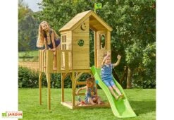 Cette petite aire de jeux est destinée aux enfants à partir de 18 mois et comprend une cabane montée sur pilotis et un petit toboggan de 1,2 m de longueur. La structure mesure 1,87 m de longueur, 1,31 m de largeur et 1,97 m de hauteur.
