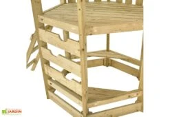 L’enfant accède à la cabane grâce à une petite échelle avec 2 marches. La cabane comprend une fenêtre, une porte latérale par laquelle l’enfant entre en rampant, et une grande porte principale pour descendre le toboggan.