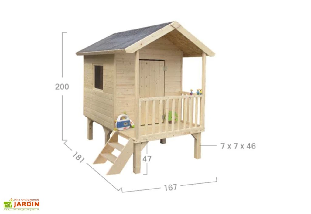La maisonnette mesure 167 x 181 cm (largeur, longueur), sur 200 cm de haut. Les dimensions intérieures de cette cabane pour enfant sont de 114,7 x 117 cm (longueur, largeur), soit 1,34 m². Le passage de la porte mesure 50,6 cm de large et l’épaisseur du bois est de 12 mm. Elle repose sur 6 pieds de 7 x 7 cm de section et 46 cm de haut.