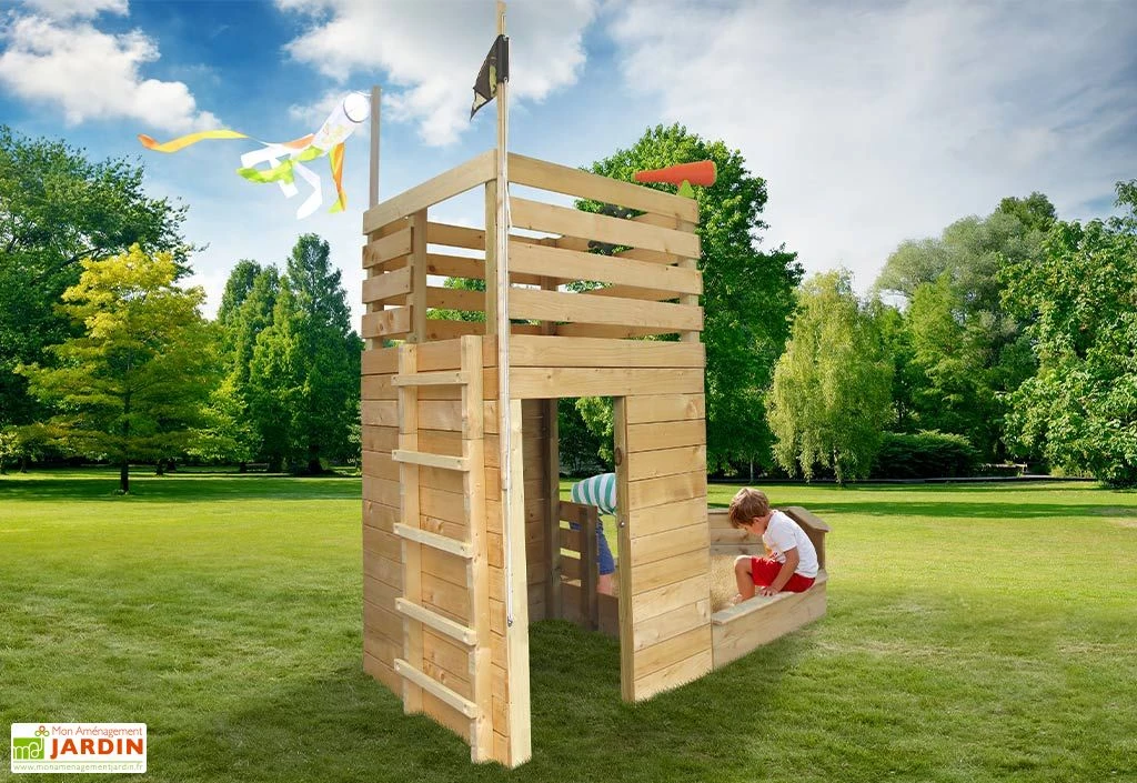 Cette cabane en bois Soulet aux allures de bateau pirate est en fait une petite aire de jeux qui comprend 3 espaces :