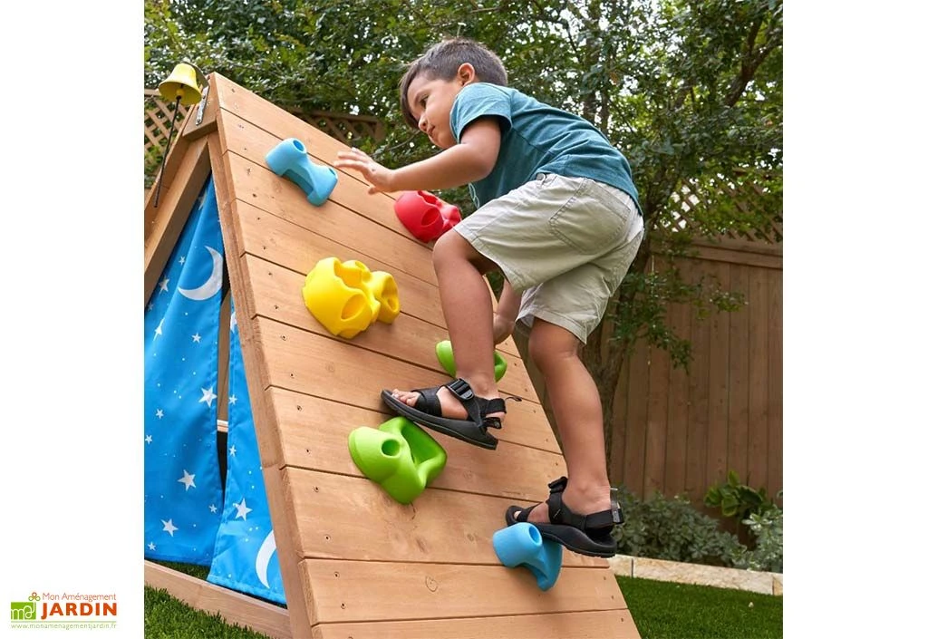 Cette cabane pour enfant de la marque Kidkraft prend la forme d’un tipi en bois dont l’un des côtés est équipé de prises d’escalade. Votre enfant pourra donc jouer, lire ou se reposer à l’intérieur du tipi et se dépenser en se hissant au sommet du mur d’escalade ! La cabane est également dotée d’une fenêtre et dispose de rideaux en tissu en guise de portes, pour plus d’intimité.