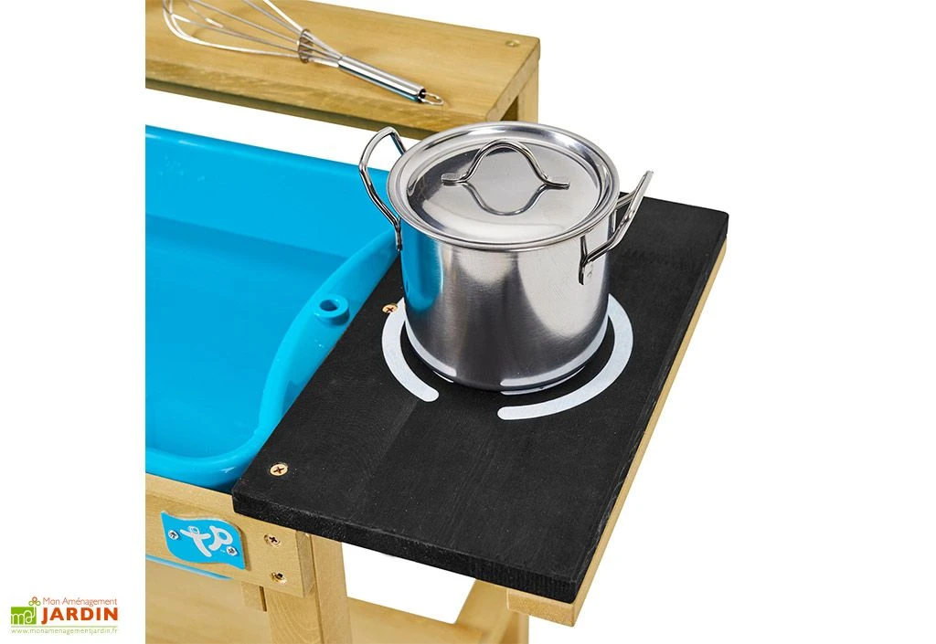 Cette cuisine d’extérieur de la marque TP Toys se compose d’une plaque de cuisson, d’un comptoir, d’une bassine amovible et d’une étagère de rangement pour entreposer les casseroles en acier inoxydable incluses avec la cuisine.