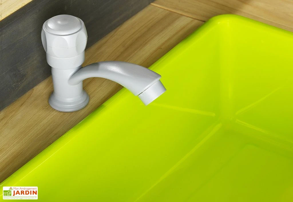 Si les plaques et le four sont bien entendu factices, cette cuisine est en revanche équipée d’un robinet tout à fait opérationnel. Que votre enfant souhaite nettoyer ses ustensiles de cuisine ou se rafraîchir les jours d’été, ce robinet fonctionnera parfaitement. Il suffit pour cela de le relier à un tuyau d’arrosage. Notez qu’une fois rempli, l’évier amovible pourra être vidé en toute simplicité.