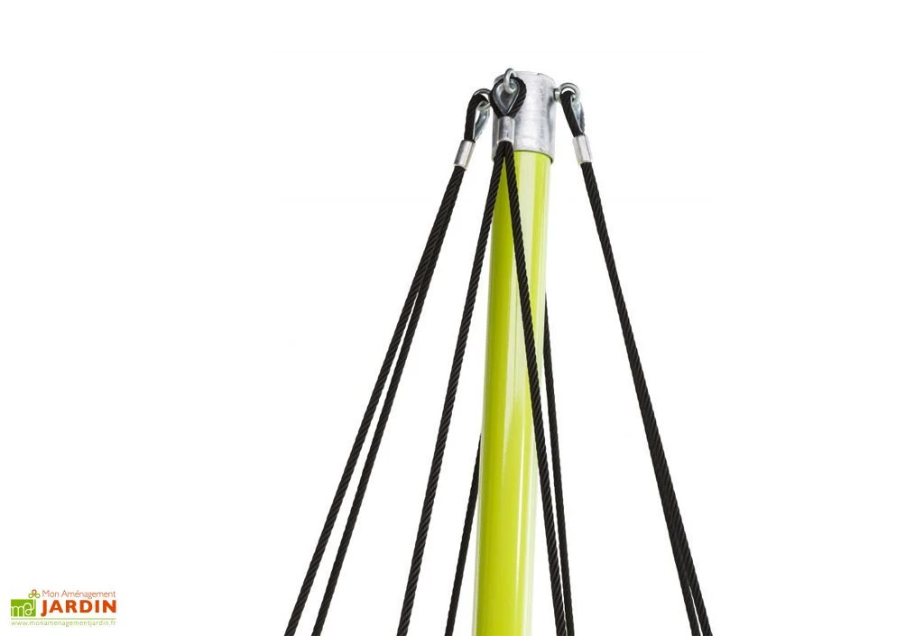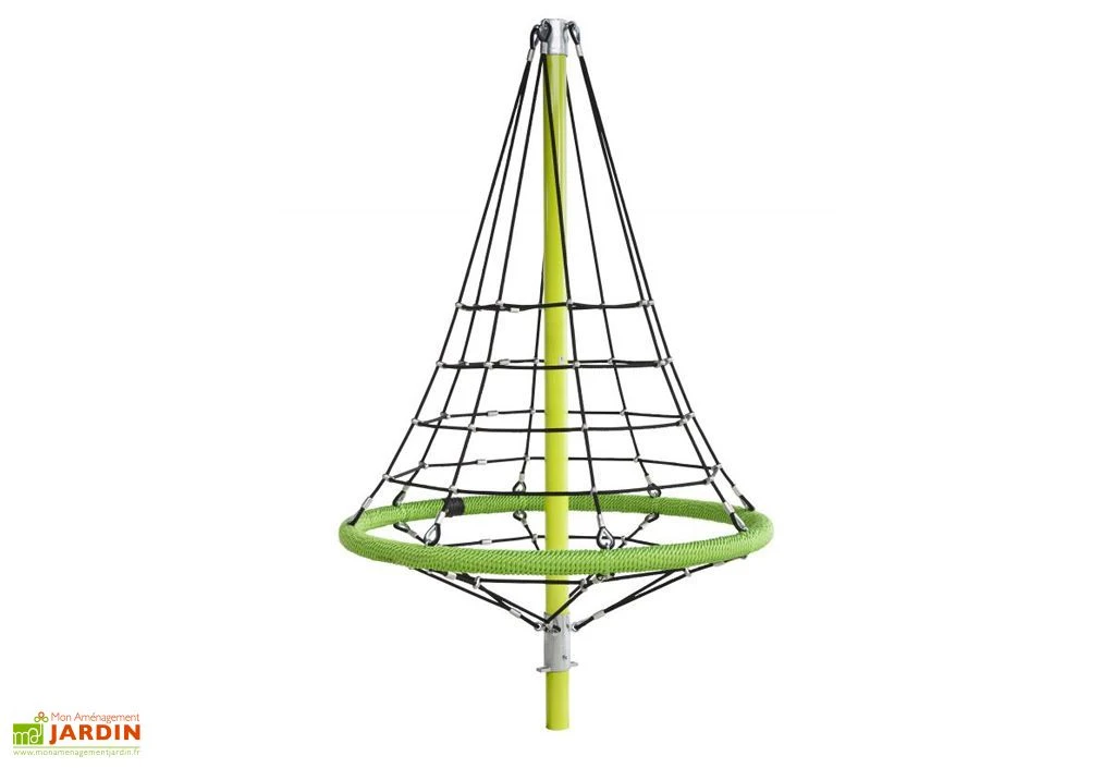 Le jeu à grimper de chez KBT est en cordes armées solides de 16 mm de diamètre. Il mesure 2,70 m de hauteur et 3,56 m de largeur. Les connecteurs sont en aluminium, un matériau résistant à la corrosion. Le pilier central est thermolaqué par poudrage avec capuchon galvanisé à chaud. Le jeu à grimper doit être ancré dans le béton. L’ancrage est inclus. La structure ne tourne pas. Le jeu peut être installé aussi bien chez un particulier que dans une collectivité. Il est certifié TÜV. La garantie est de deux ans.