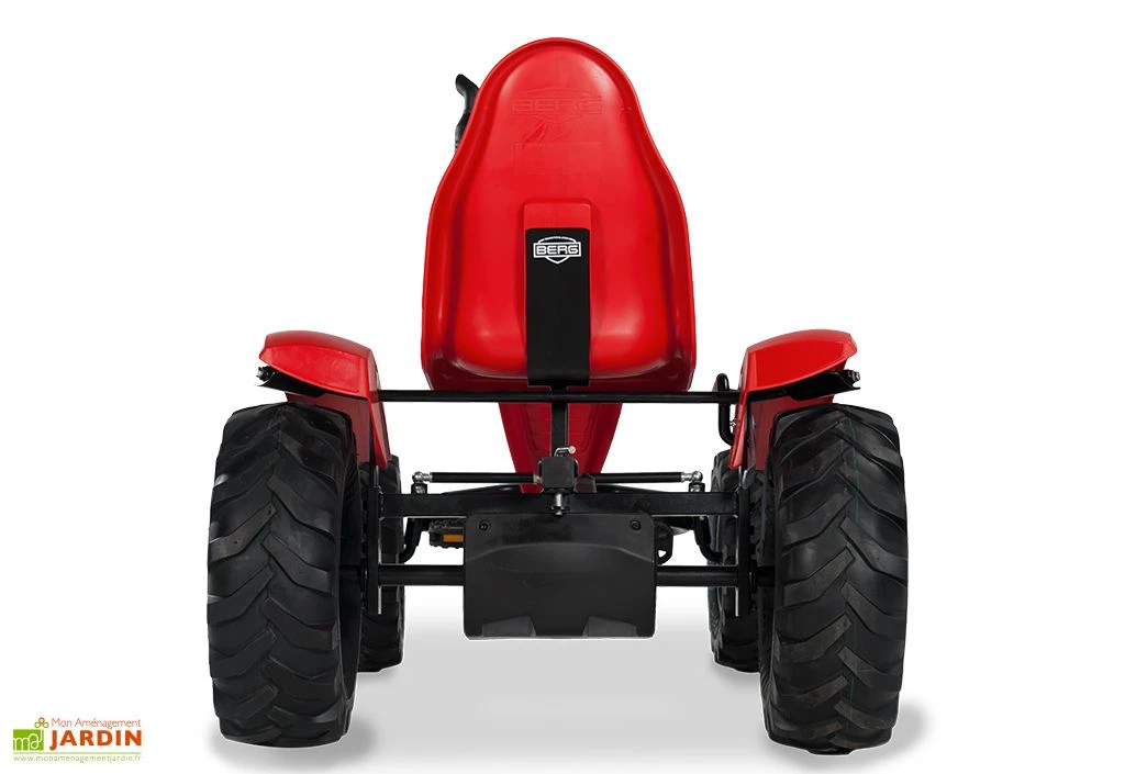 Le kart à pédales Berg Case IH s’est vu doté d’un design qui n’est pas sans rappeler celui d’un tracteur, et arbore même la fameuse couleur rouge des machines agricoles de la marque américaine Case IH. Il offre toutefois une conduite bien plus souple qu’un véritable tracteur, notamment grâce à son essieu oscillant conçu pour compenser les irrégularités de terrain.