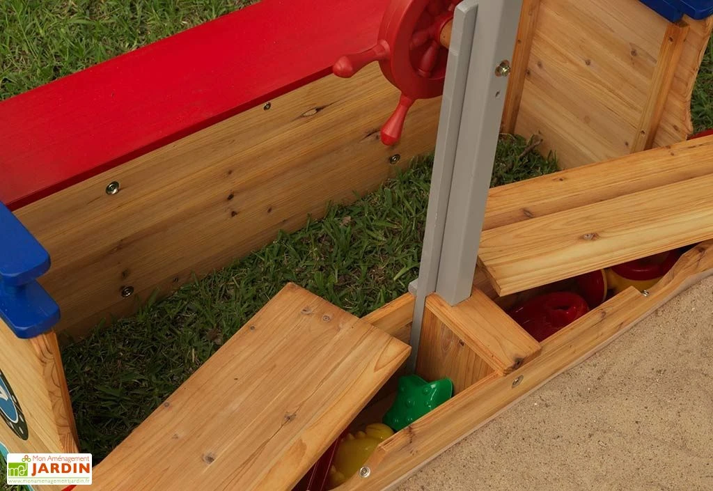 Original, ce bac à sable dispose également de décorations sur le thème de la piraterie. Une bâche en plastique, incluse, est placée sous le sable. Le bac à sable est livré en kit. Il se monte en 1h30 à 2h à deux personnes. Seuls un tournevis et des pinces sont nécessaires.