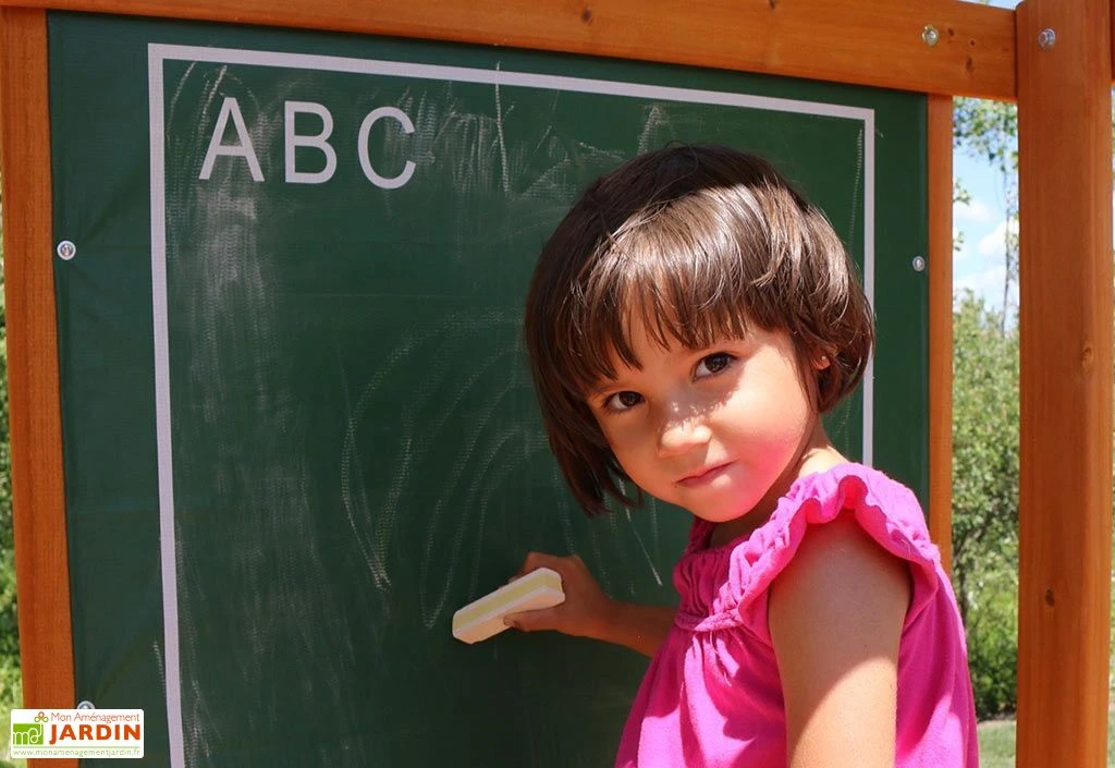 La tour en bois est équipée d’un auvent qui protège les enfants du soleil. Sur la plateforme les enfants trouveront un tableau noir en toile. Les balançoires, le toboggan et l’escalade permettent de développer leur force pendant que le bac à sable et le tableau développent leur imagination.