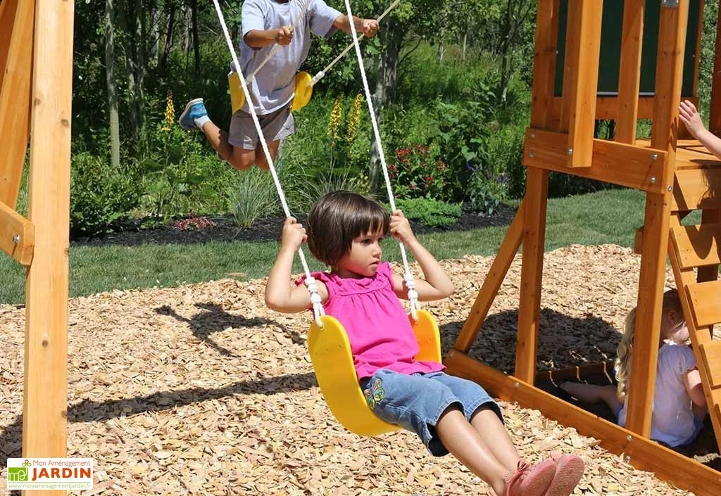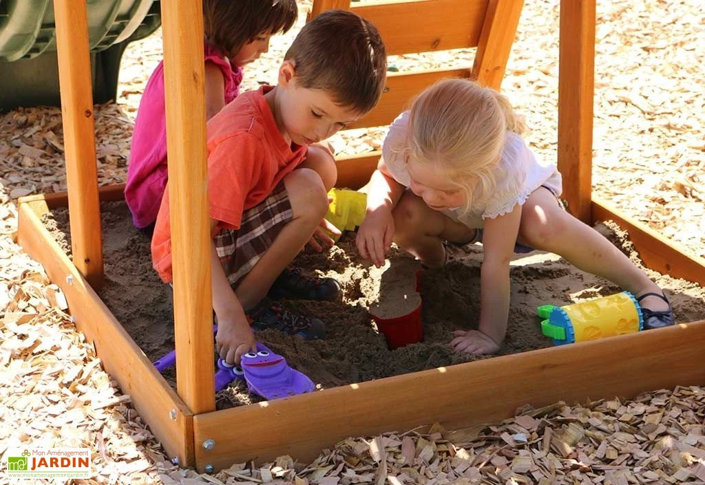 L’aire de jeux est en cèdre. Elle mesure 3,13 m de longueur, 2,74 m de largeur et 2,42 m de hauteur.