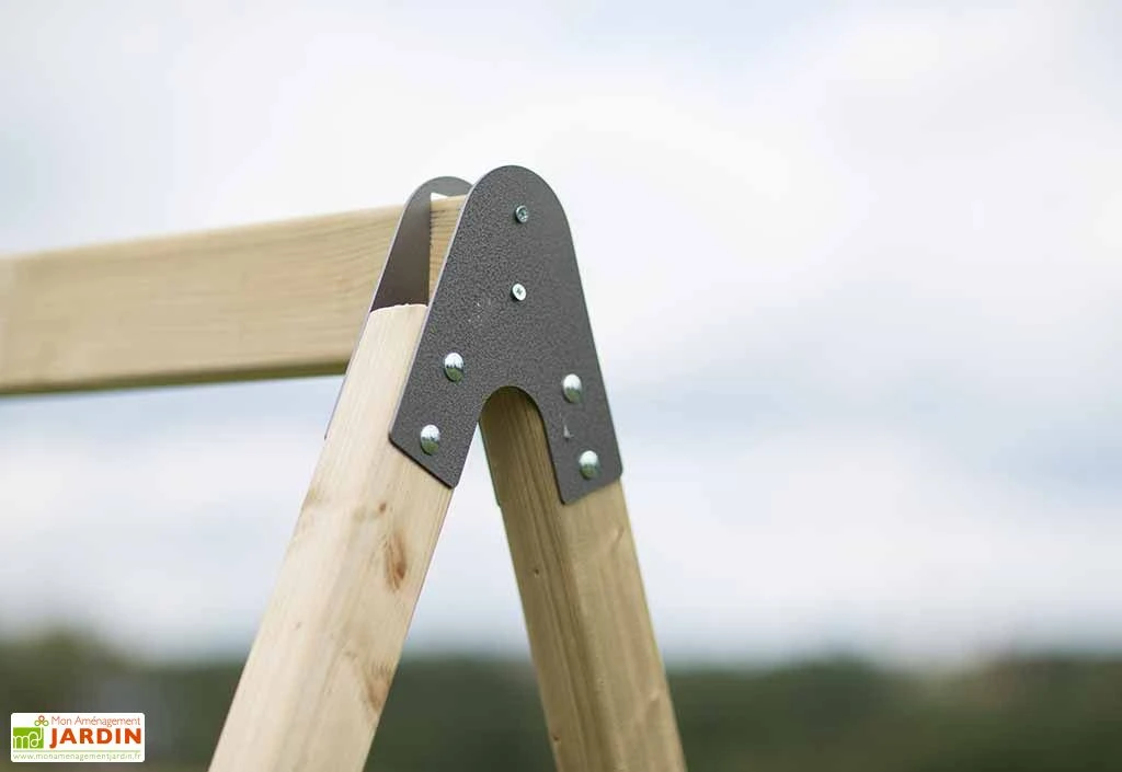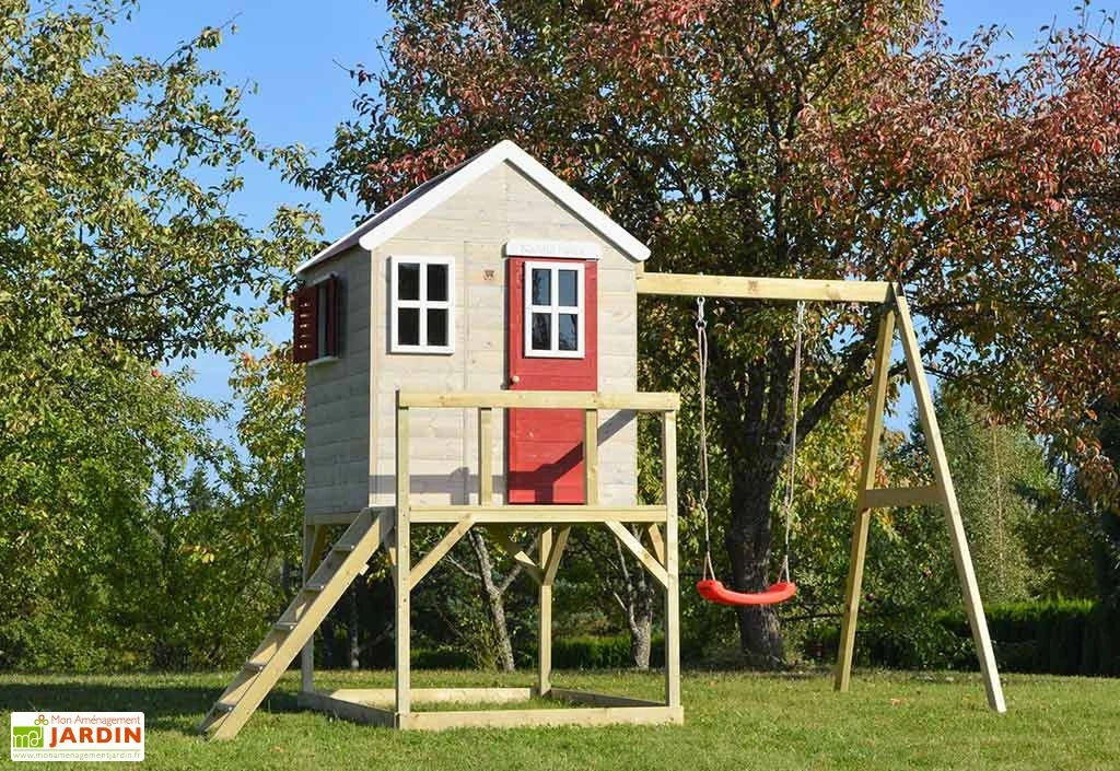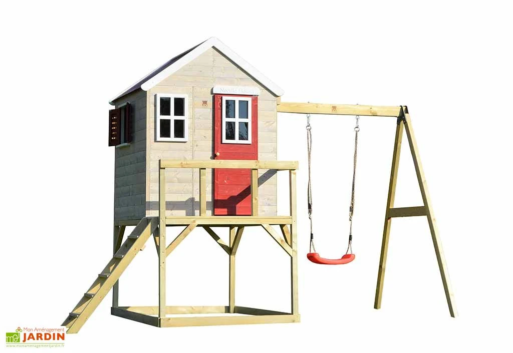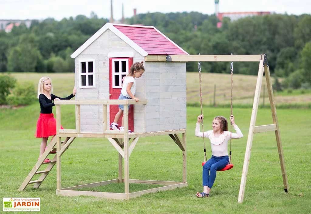 La cabane sur pilotis Zèbre de la marque Wendi Toys est destinée aux enfants âgés d’au moins 3 ans. Elle est montée sur une plateforme située à 90 cm de hauteur et est accompagnée d’un portique avec balançoire. Le tout mesure 3,50 m de large sur 1,92 m de profondeur, ce qui signifie que l’aire de jeux occupera une surface de 6,72 m² une fois installée dans votre jardin.