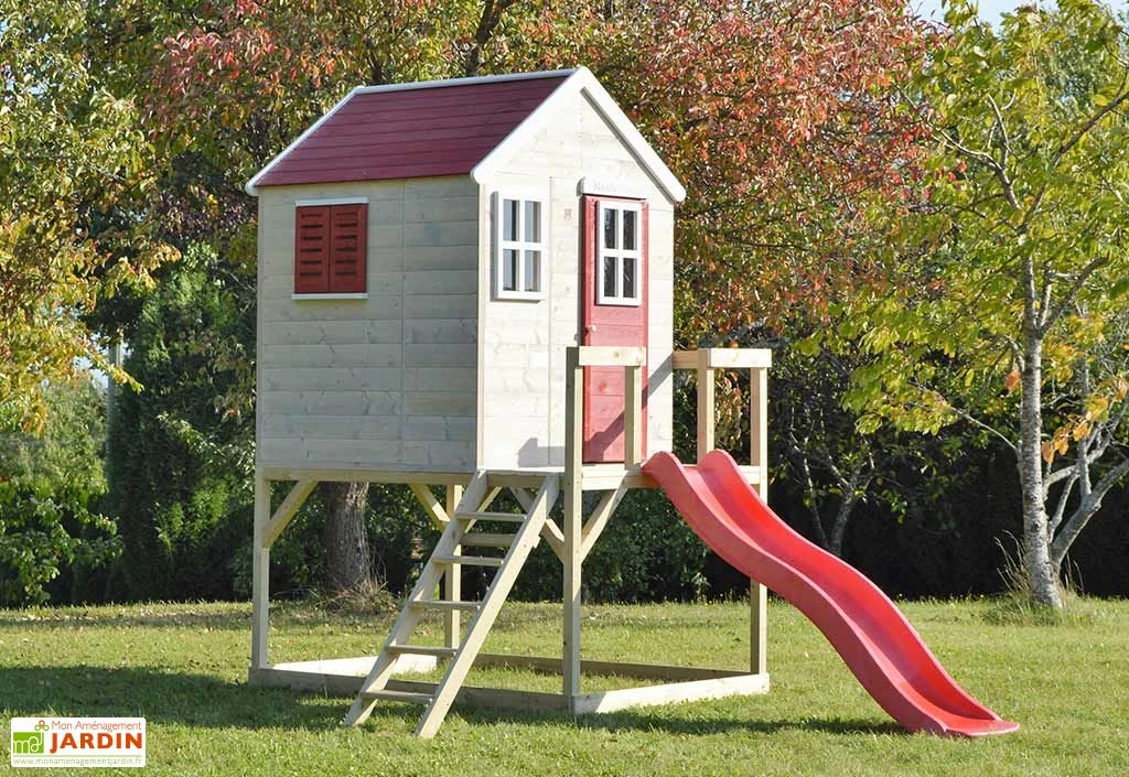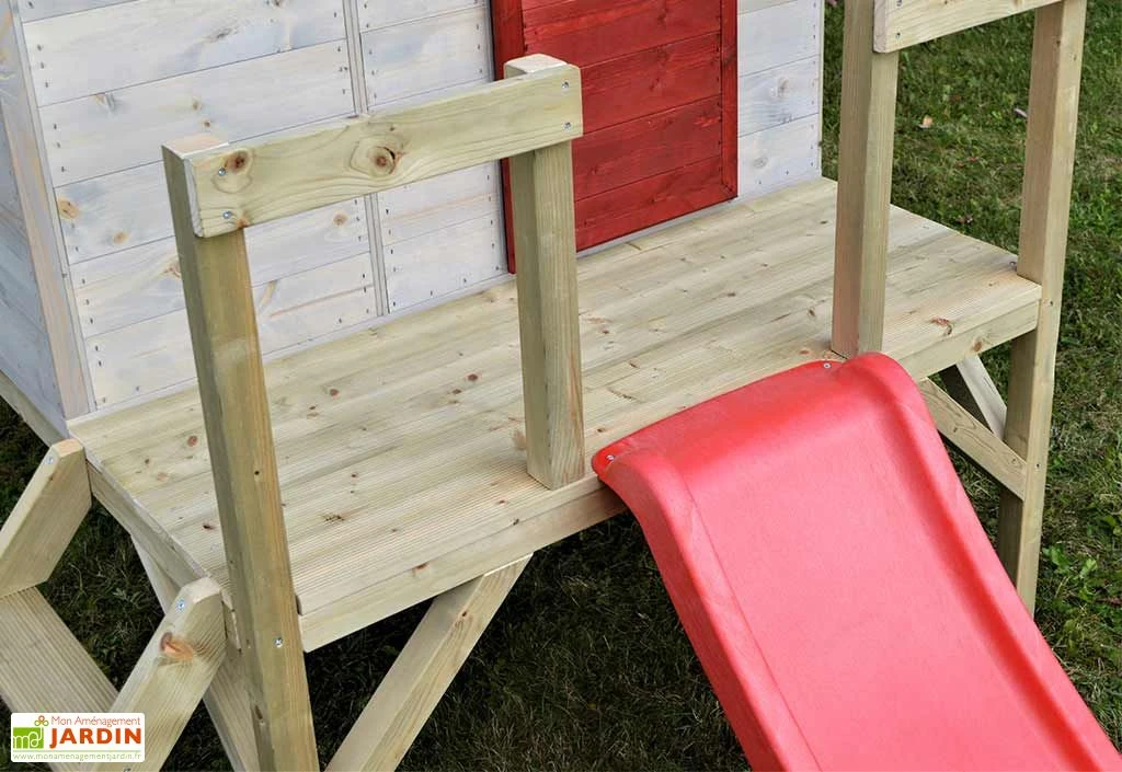 La maisonnette pour enfant Tigre de la marque Wendi Toys est montée sur pilotis, à 90 cm de hauteur, ce qui lui permet d’intégrer un toboggan en plastique. Elle s’adresse aux enfants âgés d’au moins 3 ans et est conforme à la norme EN 71. Ses dimensions de 1,97 x 3,10 m (largeur x profondeur) lui permettent par ailleurs de n’occuper que 6,1 m², ce qui est idéal pour les petits jardins.