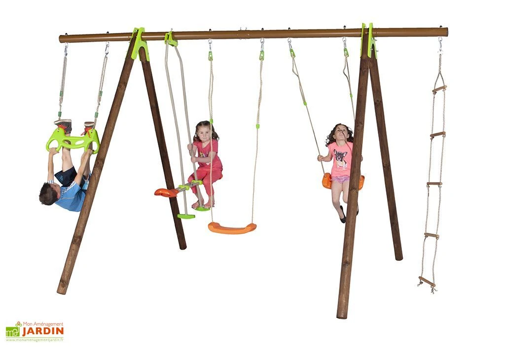 Fabriqué en France, ce portique est conçu pour les enfants âgés de 3 à 12 ans. S’il peut accueillir cinq agrès, il est cependant livré accompagné de huit, à savoir deux balançoires réglables, une échelle de corde, une face-à-face, un trapèze en métal, une corde à nœuds, un trapèze anneaux et un siège bébé en plastique (de 9 à 36 mois). Vous pourrez donc faire évoluer votre portique au gré des besoins et envies de vos enfants.