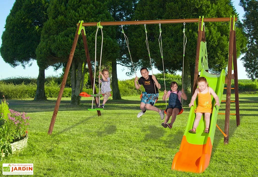 Ce portique Trigano affiche des dimensions de 3,60 x 3,41 m, pour 2,30 m de hauteur. Il comprend deux balançoires, un face-à-face et un toboggan de 2,63 m de long. Le toboggan est rattaché à une plate-forme située à 1,20 m de hauteur accessible grâce à une petite échelle et protégée par deux garde-corps. Les balançoires pourront par ailleurs être réglées afin de les adapter à la taille de vos enfants (de 3 à 12 ans).